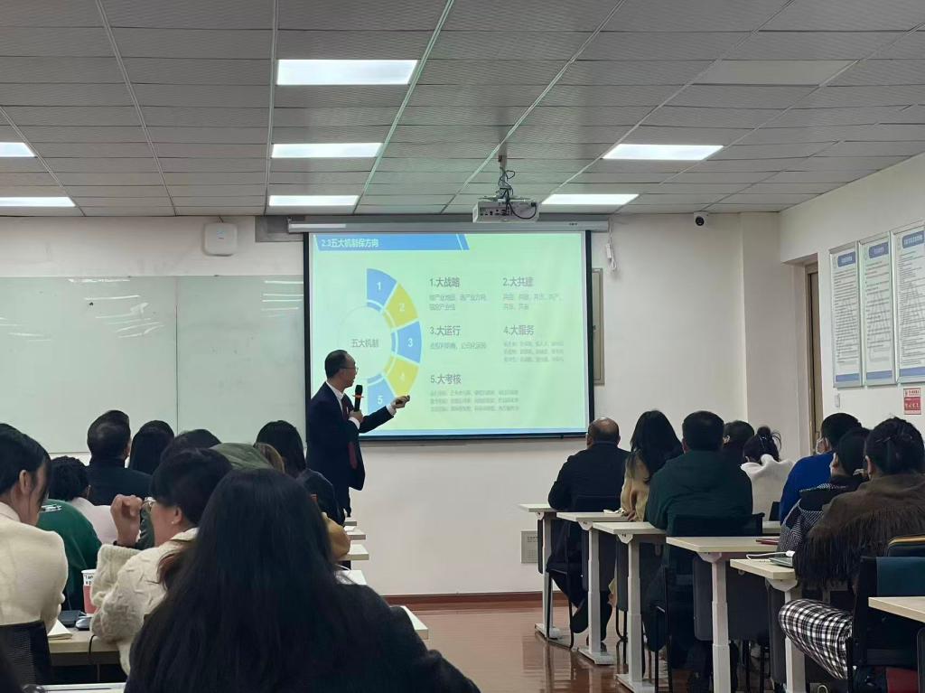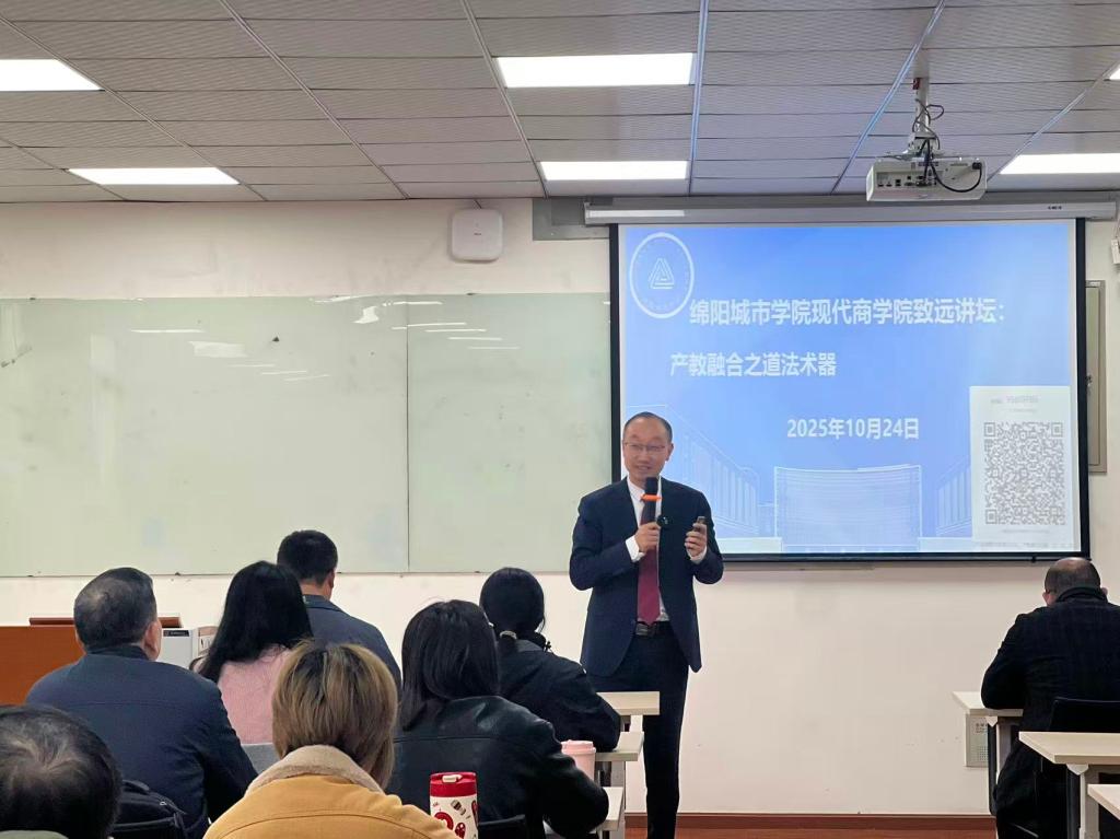 2025年10月24日,现代商学院线上线下联动,于博识楼406室成功举办“致远讲坛”系列活动。本次讲坛以“产教融合·协同育人”为主题,聚焦高校依托产教融合推动教育变革、提升人才培养质量,并系统分享了产教融合的理念、路径与实践经验。西南财经大学天府学院何亮教授担任主讲,学院全体专任教师参与学习交流。