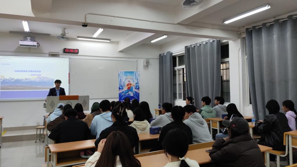 2025年10月31日下午,现代商学院金融教研室邀请国泰海通证券四川分公司举办“共探财富管理,把握投资机遇”专题讲座。国泰海通证券首席策略分析师邓明煜担任主讲,现代商学院金融工程专业魏霄老师主持讲座,“谈股论金”社团全程协助。